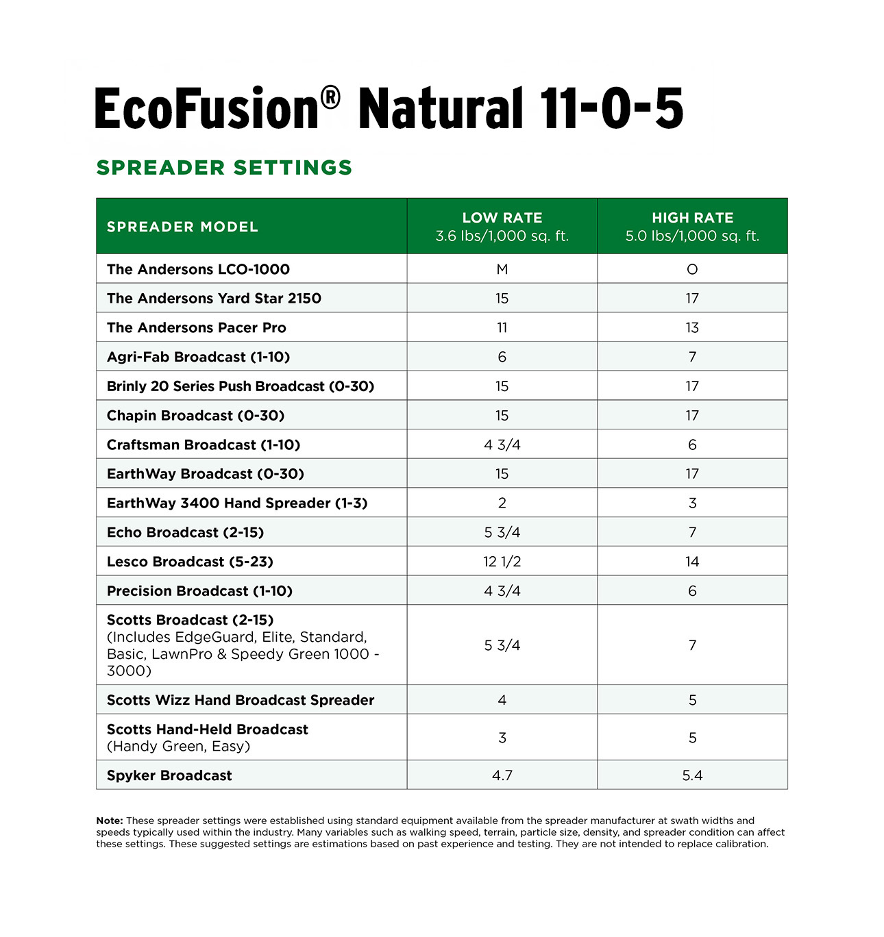 We recommend using a broadcast spreader. These spreader settings are a guide. Many variables such as walking speed, terrain, particle size, density, and spreader condition can affect these settings. Be sure to calibrate your spreader before every application.