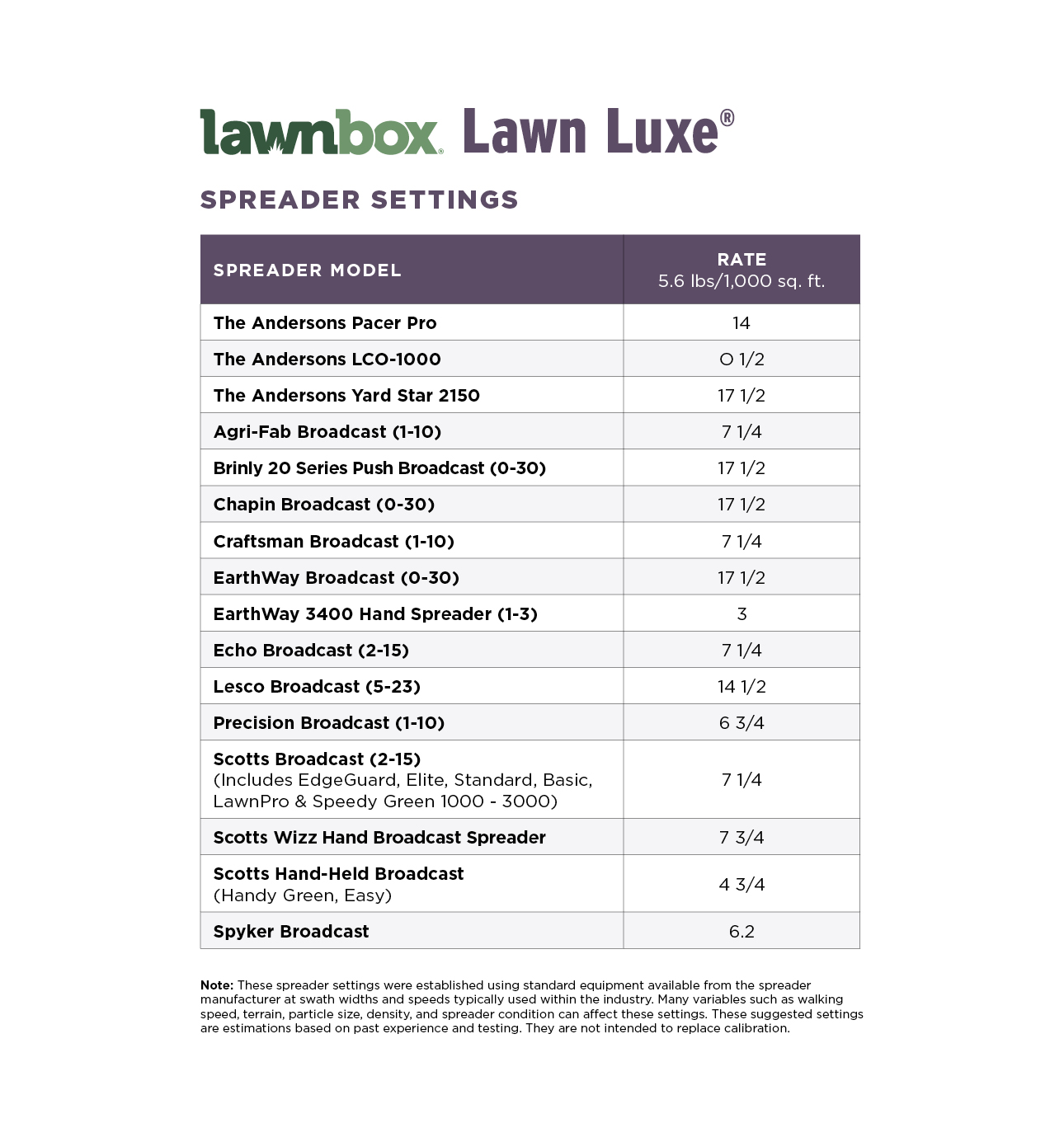 We recommend using a broadcast spreader. These spreader settings are a guide. Many variables such as walking speed, terrain, particle size, density, and spreader condition can affect these settings. Be sure to calibrate your spreader before every application.