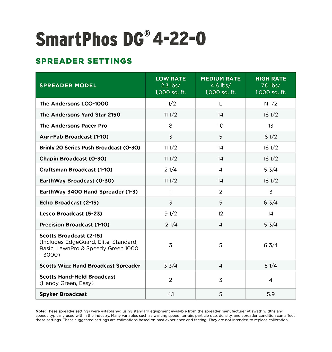We recommend using a broadcast spreader. These spreader settings are a guide. Many variables such as walking speed, terrain, particle size, density, and spreader condition can affect these settings. Be sure to calibrate your spreader before every application.